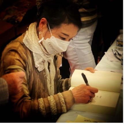 三时四十分左右,严歌苓与劳伦斯·沃克,领着他们的小狗嘟嘟,在义工陪同下进入展厅,马上被提前到场,争先恐后地购买新书的书迷们围住。严歌苓坐下, 席不暇暖,便开始为读者们签书留念,周围排队的书迷们纷纷举起手机拍照。为争取时间尽量满足读者,四点钟演讲开始前和演讲后,严歌苓一直握笔在奋力地签书。