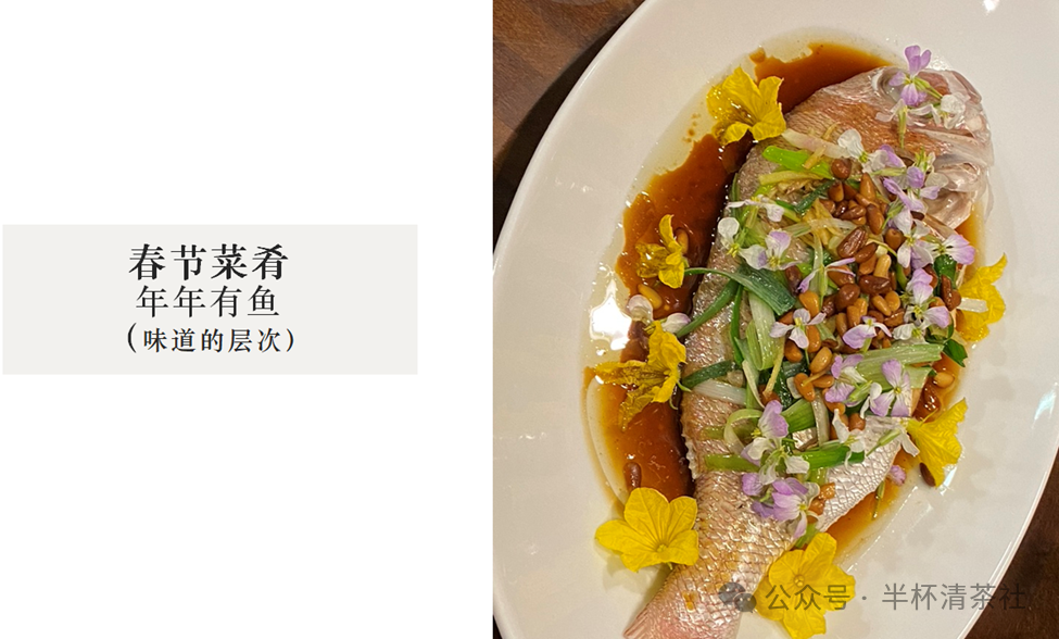 年年有鱼:避开春节红火的颜色,选用淡雅的春色为底,松子炸香,松油浇透鱼肉。用萝卜花和黄瓜花作点缀,黄紫相间,味道清淡。