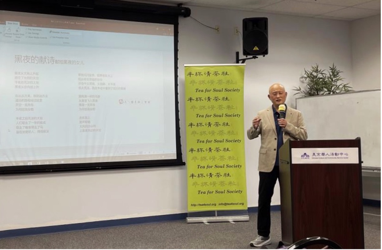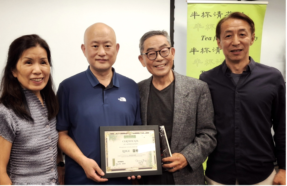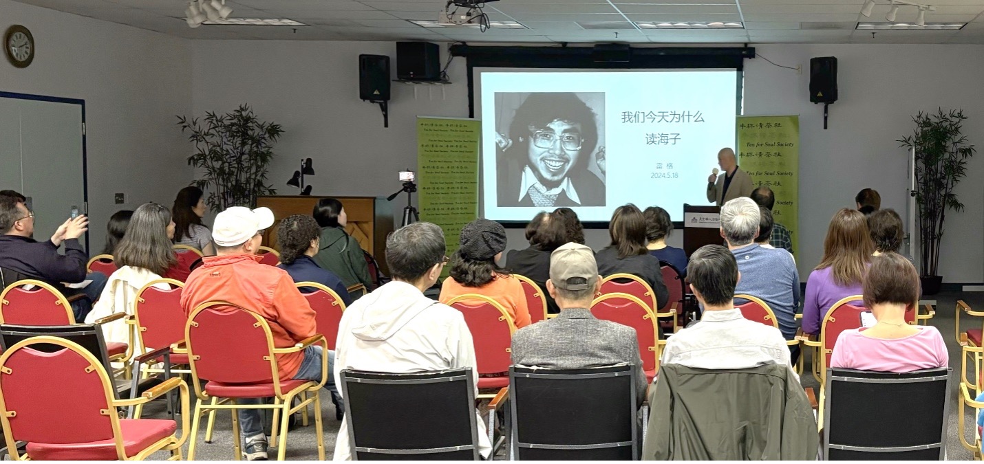 2024年5月18日,华盛顿春雨绵绵。诗人雷格应半杯清茶社之邀,在美京华人活动中心以 “我们今天为什么读海子” 为题,解读海子其人其诗,并和现场约三十多名半杯社员、北大校友等交流诗艺。活动持续了两个多小时。讲座结束后,他接受了半杯清茶社的感谢状以及北大学长许之微(也是诗人海子的皖籍同乡)的赠书。