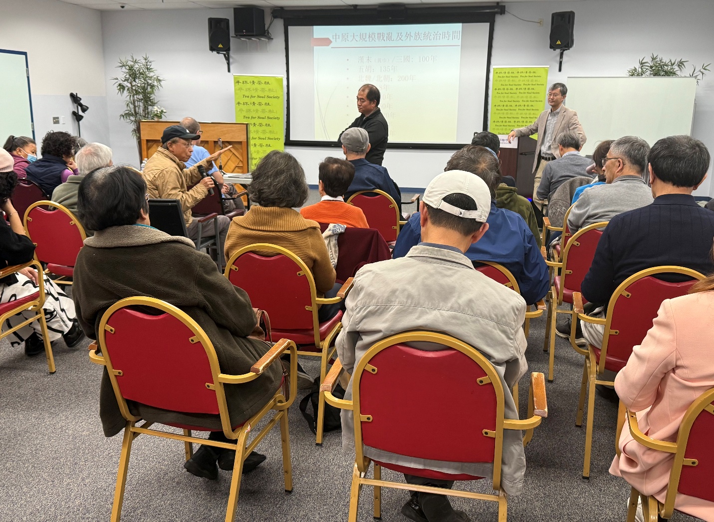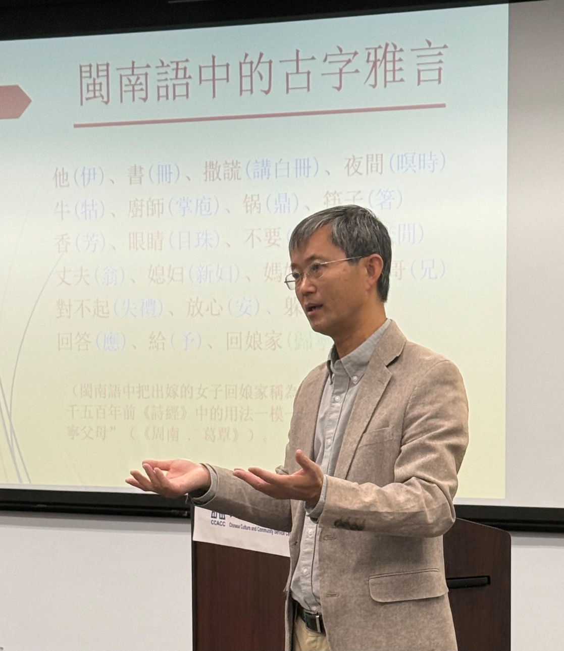 華府的週六是繁忙的,幾天之後的感恩節讓2025年11月22日這個週六更是閒暇難求。走在枯葉散落的大地上,秋實的寧靜和篤定讓人感動。下午2點,半杯清茶社資深會員邵立榮先生站在美京華人活動中心(CCACC)音樂廳的講臺上,爲近50名聽衆帶來了半杯论壇今天的主題演講:語海拾貝 - 閒話方言中的古字古意與古音。