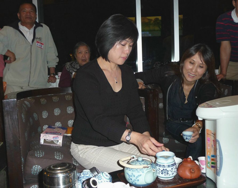 晚会首先由半杯社的老朋友、华府荣光会副秘书长陈坤民和他刚从台湾来访的胞妹、茶艺专家陈锦霞向与会人士介绍台湾冻顶乌龙茶的特色和茶道工艺,并现场用获得台湾南投鹿谷农会一等茶奖的精选春茶,泡制清香醇浓的功夫茶供来宾品尝。《华盛顿新闻》报社社长黄瑞礼和李静芳夫妇手持香味扑鼻的功夫茶兴奋地说:“节日里终于喝到道地的家乡好茶了!”