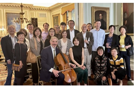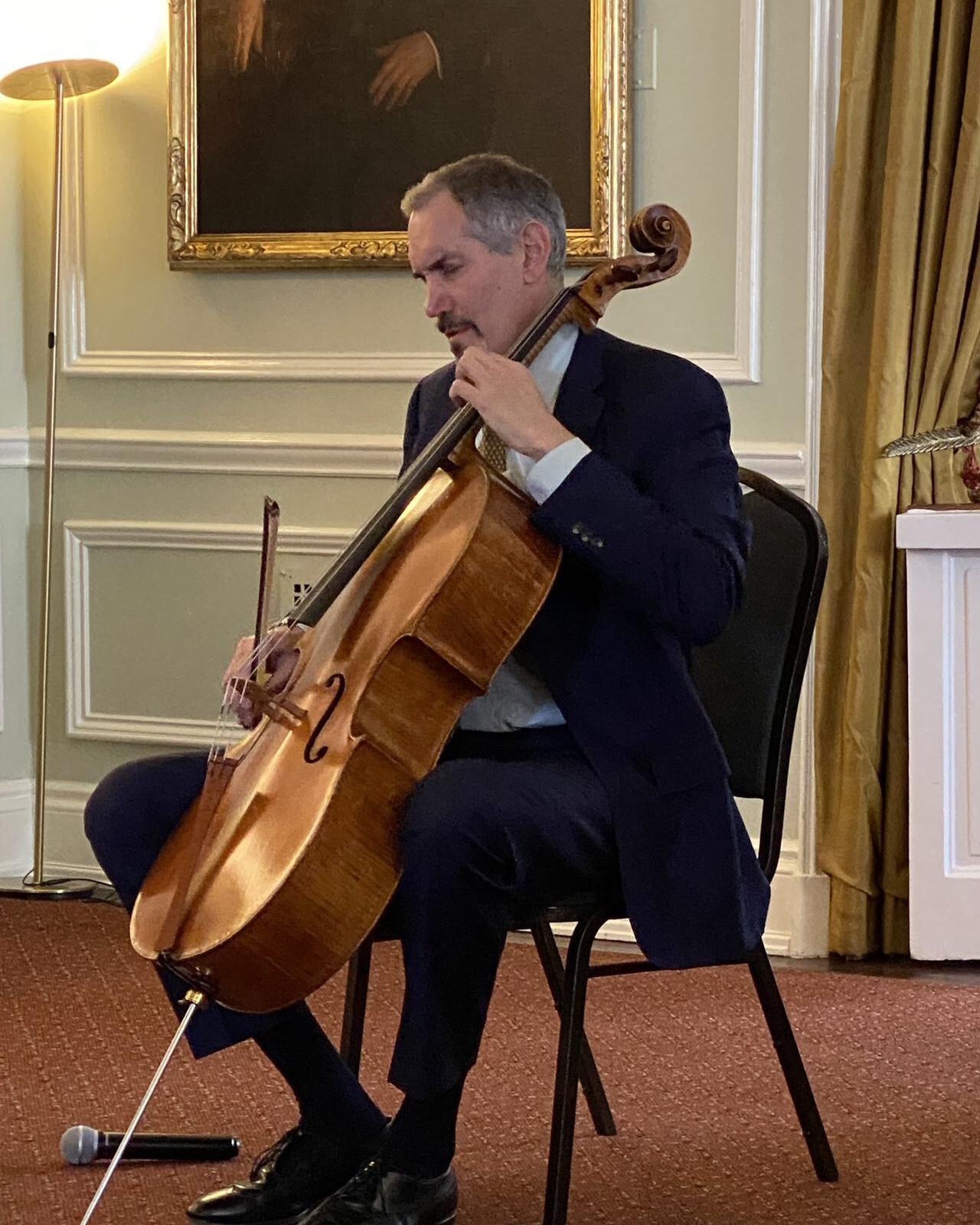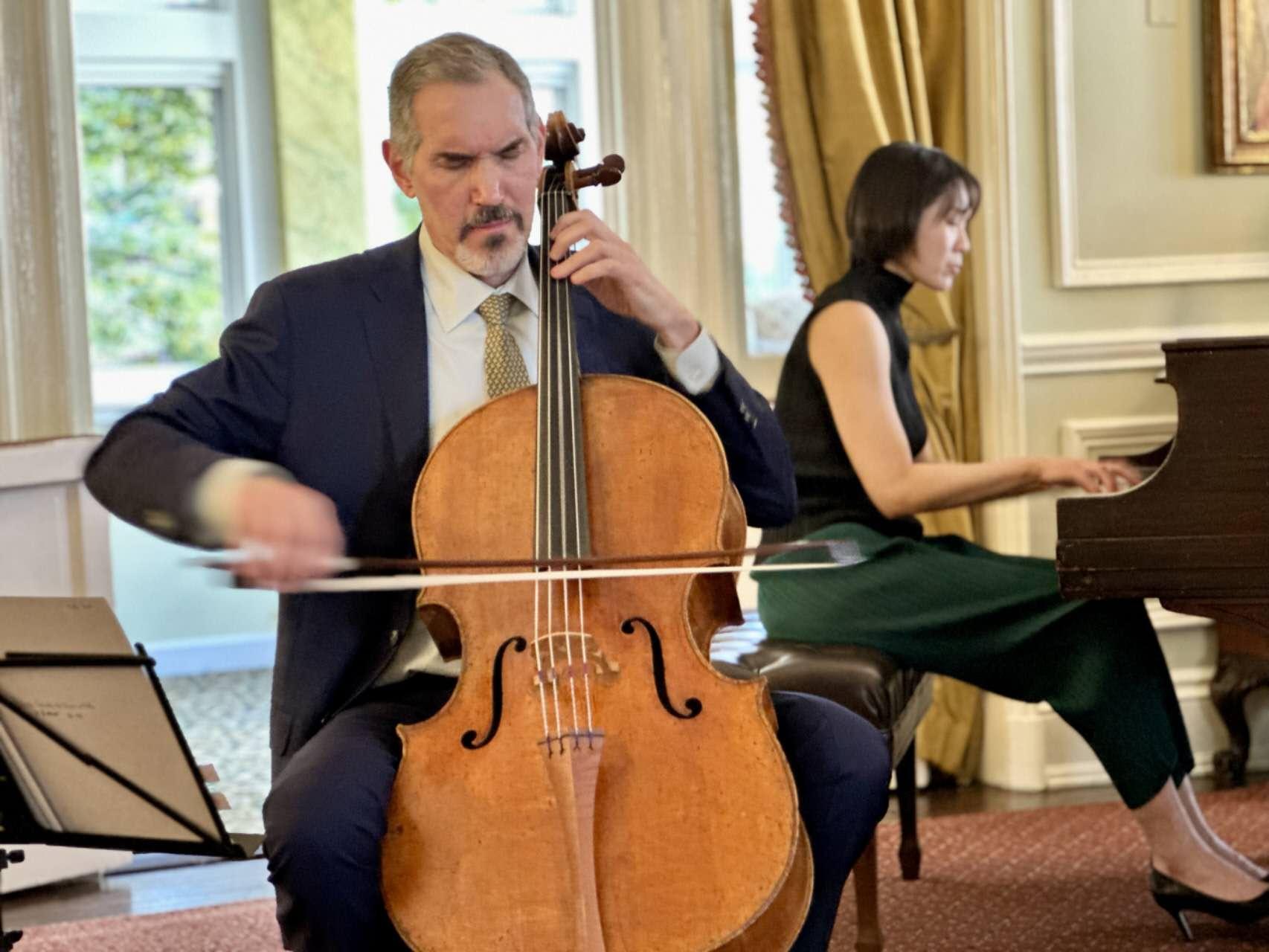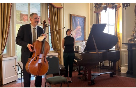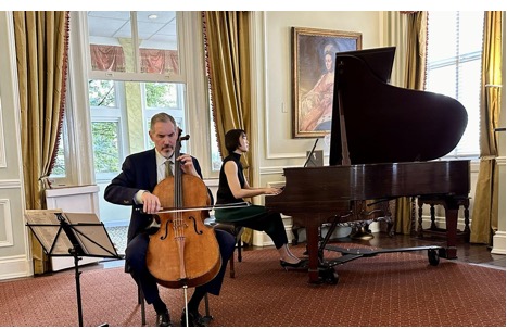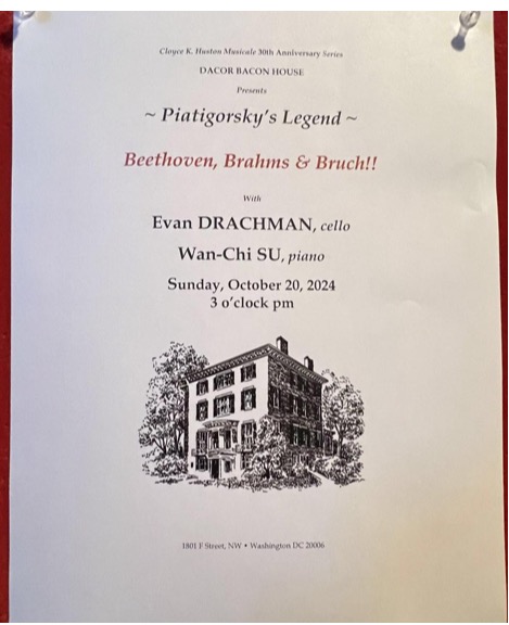 时逢金秋十月,在晴朗明媚的10月20日周日下午,华盛顿地区半杯清茶社的二十多位会友荣幸出席观赏了一场美妙动听的大提琴与钢琴室内乐音乐会。本场音乐聚会是由半杯清茶社与华盛顿的退休外交与领事官员协会 (DACOR) 联合在DACOR-Bacon之家举行,由国际知名大提琴演奏家 (Evan Drachman) 联手钢琴演奏家蘇婉淇博士 (Dr. Wan-Chi Su) 出演贝多芬 (Beethoven)、勃拉姆斯 (Brahms) 与布鲁赫 (Bruch) 的经典作品。