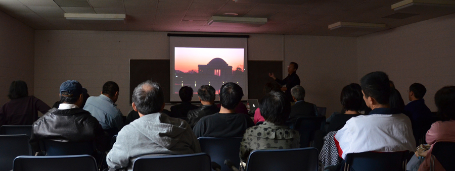 摄影艺术家龚锦先生应半杯清茶社之邀,十月二十二日在马州蒙郡戴维斯图书馆以 "怎样创作一幅好的照片"为题目发表演讲,同近四十位摄影爱好者和文友们分享他多年来从事摄影创作所积累的经验、心得、和艺术感悟。龚锦从分析、点评摄影作品实例入手,就摄影取景的主题和瞬间把握,光线、角度、色调的控制与利用以及成像构图等关键创作要素,辅以自己在野外摄影和创作过程中的内心感受, 深入浅出、形象生动地说明和展示了摄影创作之基本要领和美学意境,深获与会摄影爱好者的赞誉和好评。