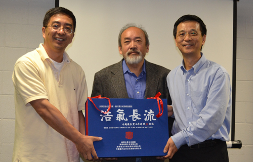 最后,王康先生还谈到了展览准备活动中出现的一些感人花絮。得知王康先生即将只身前往纽约布置10月的展出,多位半杯会员当场捐助以壮行色。王康曾经说过,"浩画的赞助者是木匠,是生死与之的高人、义士!我们不敢自诩"得道多助",但《浩》画确实劳师动众,几乎无远弗届。"他也希望画卷的展出和纪念抗战胜利七十周年的活动能有助于国共两党的合作和两岸的和平。讲座结束时,王康先生向半杯清茶社赠送了重达36斤的《浩气长流》缩印本。半杯清茶社将在以后的讲座活动中,持续展示《浩气长流》。在欣赏这部举世无双的艺术作品的同时,也表达我们对抗日英烈和巨画创作者们的崇高敬意。