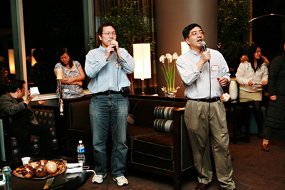 夜深了,人们谈兴还酣,歌声依然缭绕不绝;看大楼之外,万家灯火兴,车水马龙盛, 我们所熟悉的城市,只是因为自己所在的高度和角度的不同,竟会有如此壮观的画面呈现在眼前。不少与会人士表示," 半杯清茶社" 每月举办的活动, 为人们提供了日常工作和生活之外的精神家园,大家以文会友,坦诚交流,分享生活中的感受和喜悦,用心在海外耕耘属於自己的精神家园, 此所谓"乡关虽重重,此地可为家" 。胡宏和薛海培更为日后" 半杯清茶社"举办的文化活动和如何丰富大家共同的精神家园出谋划策,分享心得, 此情此义,感人至深。另外," 半杯清茶社"的文友们在坐而论道的同时,亦不忘起而行,协助“新世界时报”主办“社区论坛”专栏, 就侨社普遍关心的热点话题,如电影“色,戒”,中西方文化冲击,婚外情等主题展开专题讨论。“社区论坛”专栏隔周在“新世界时报”上同读者见面,敬请垂注。 欲了解"半杯清茶社"活动 详情,请参访"半杯"网页 www.tea4soul.org 或发电邮至 contact@tea4soul.org